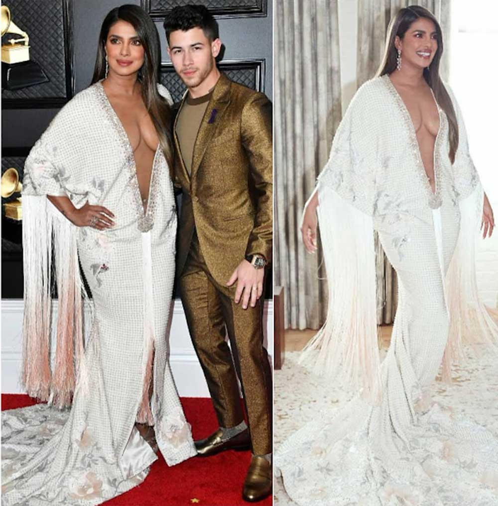 Plus, of course, one of the biggest pleasure for viewers was taking in all the red carpet fashion highlights, starting with nominee Ariana Grande’s show-stopping ruffled Cinderella-like dress. The singer who also delivered a powerhouse performance with a mix of songs from her album Thank U, Next, opted for an oversized, romantic dove grey tulle Giambattista Valli ballgown, which she accessorised with matching opera-style gloves. While performer, jubilant first-time winner and one of the most nominated artists Lizzo reminded us of Britney Spears in an all-white look, she also channelled Diana Ross. The star, who nabbed Best Traditional R&B Performance for Jerome, paired her white strapless Atelier Versace gown, which came with diamante detail and split, with a long feather boa and a diamond necklace. Priyanka Chopra also looked phenomenal in an ivory sequin-encrusted silk crêpe cady kimono. The plunging Ralph & Russo couture creation was hand painted with peonies and embellished with opal stones, 3D organza petals and featured peach ombré fringed sleeves. Also wearing ivory was award presenter Dua Lipa, who looked gorgeous in her 90s-style slinky satin two-piece set.
