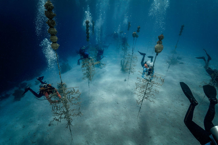 Lorenzo Mittiga, a marine biologist who lives on the island, explained more about the process, "The coral nurseries are rows of 'trees' that are tethered to the bottom of the sea with sand anchors and buoyed with floats that sit just below the surface. Each tree holds a unique genetic strain of coral, and a 'full' tree can hold anywhere from 100 to 160 corals. Coral restoration means moving nursery-reared corals to restoration sites. After six to eight months growing in the nursery, corals are healthy and mature enough to be transplanted to a restoration site.”