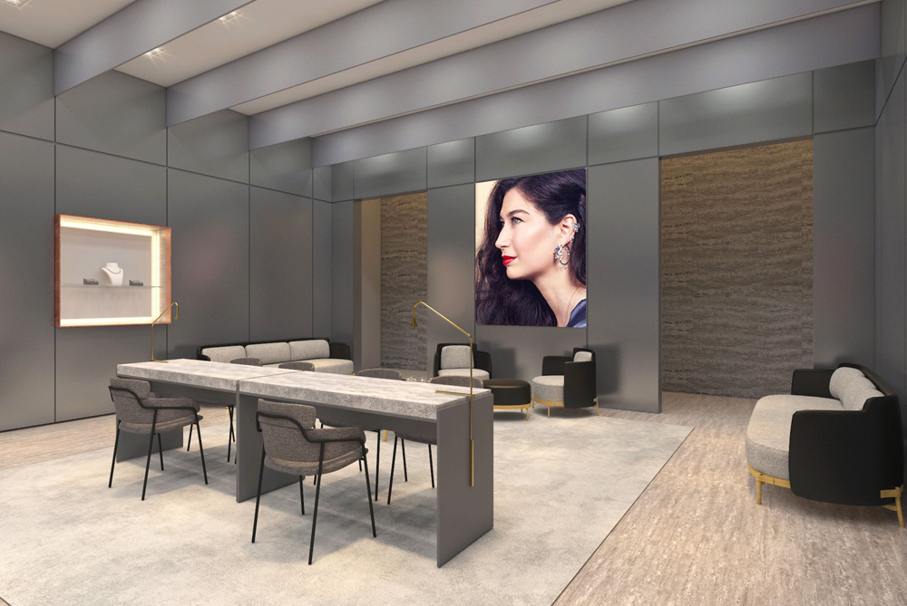 The design of the space will reflect Maria’s vision for the brand with an inviting, modern aesthetic. Hard elements like travertine stone and custom glass are balanced with soft elements like leather and upholstery to create visual harmony. Matte finishes and thoughtfully considered lighting will allow the jewelry collections to shine.