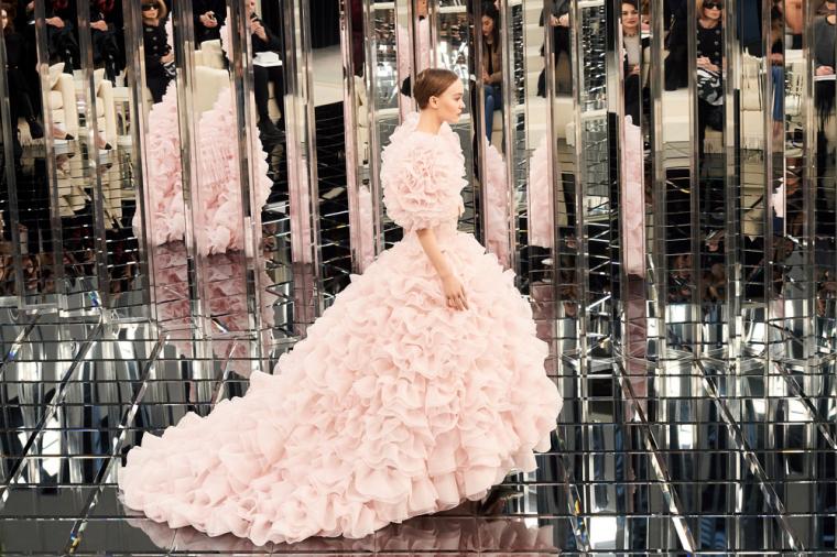 As an added bonus, Lagerfeld had major star power to add to his arsenal. Kendall Jenner appeared on the glitzy runway wearing a column gown with a dipped neckline and ring of feathers. And Bella Hadid added more magic, strutting in wearing belted sequined trousers under a sequined dress with another plunging neckline. Then Lily-Rose Depp’s status as the house’s muse was given a major boost. Lagerfeld chose the American-French actress and model to close the show in the coveted finale couture wedding gown, a blush-pink voluminous organza creation.