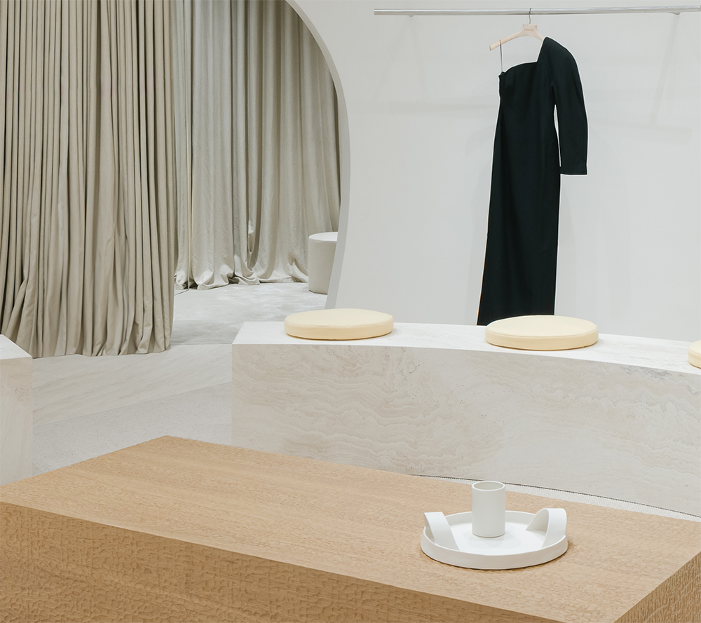 The signature JACQUEMUS silhouette defined by curvilinear forms and asymmetrical lines are portrayed throughout the store. Inviting you in with a claystone façade, the boutique takes its visitors on an exploration of its latest offerings. Four distinct spaces are separated by broad arches, which begin with bags and conclude with an expansive discovery of women’s ready-to-wear. Undulating curves contrast with sharp lines to create essential fixtures, modular displays and seating accents crafted in natural travertine, wood and brushed steel.